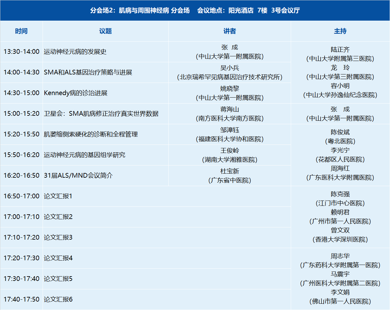 今年肌病与周围神经病分会场的主题是“运动神经元相关疾病”,围绕这一主题将邀请省内外著名专家,从不同方向进行阐述。张成教授首先将为我们讲述“运动神经元病的发展史”,全面阐述了运动神经元的前世今生,有助于我们从全盘了解这个疾病的发展脉络。吴小兵教授将为我们带来“SMA和ALS基因治疗策略与进展”,针对目前此类疾病的治疗热点,从策略和方式上给大家带来理念上的革新。姚晓黎教授长期从事运动神经元相关疾病的研究,这次姚教授将给我们解读“Kennedy病的诊治进展”,是对该病的系统综述。近两年,随着罕见病政策的落地,许多新药得以进入国内,其中针对SMA的新药,诺西那生钠为SMA患者带来希望,卫星会将由蒋海山教授介绍“SMA肌病修正治疗真实世界数据”。邹漳钰、王俊岭两位教授是国内进行ALS研究的青年才俊,此次受邀分别进行“肌萎缩侧索硬化的诊断和全程管理”以及“运动神经元病的基因组学研究”两个报告,在ALS最受关注的两个方向,介绍最新进展。杜宝新教授作为ALS研究的前沿专家,将结合自身的认识,进行“31届ALS/MND会议简介”的报告。其后,由卫材弥可保组织的周围神经病优秀论文专场,是今年省内肌病、周围神经病领域研究的集中展示,将筛选年会投稿的这一领域的优秀论文在会场进行报告。